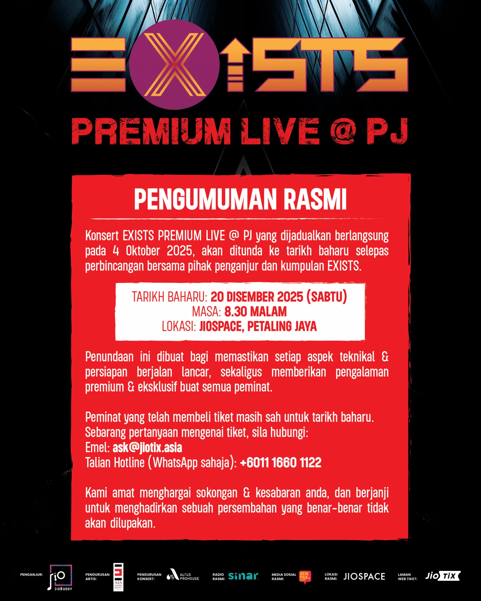 Menurut JioBuddy, penundaan ini adalah keputusan bersama Exists bagi memastikan konsert kali ini bukan sekadar persembahan biasa, tetapi sebuah pengalaman intim dan dekat dengan peminat.