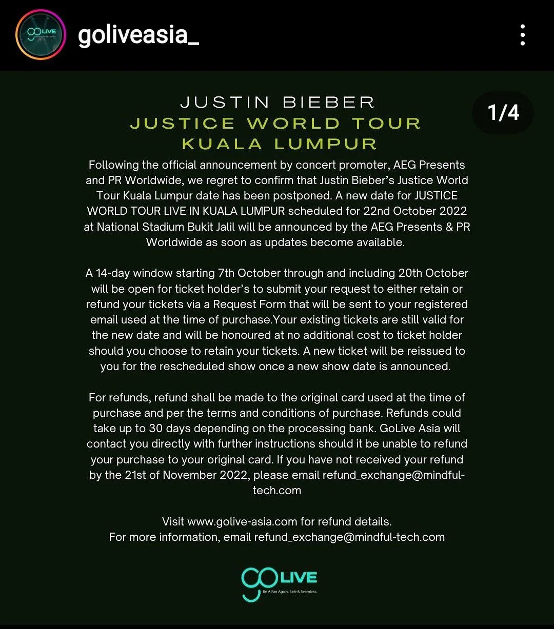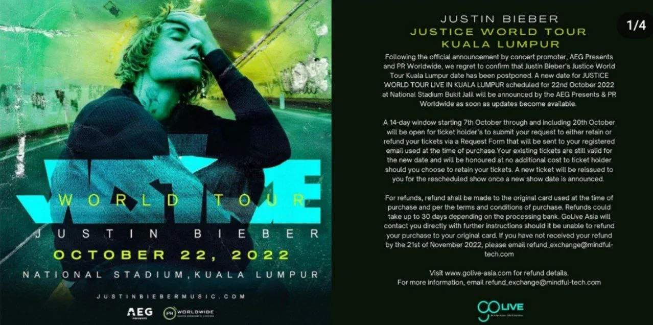 Sebelum ini, penyanyi Justin Bieber memaklumkan tentang penangguhan konsertnya atas faktor masalah kesihatan. Konsert Justin Bieber Justice World Tour yang sepatutnya berlangsung pada 22 October 2022 di Kuala lumpur ditangguhkan sehingga diberitahu.