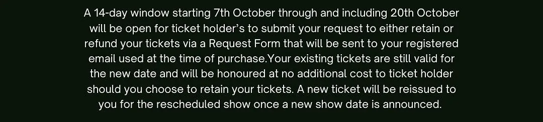 “Dalam tempoh 14, hari bermula 7 Oktober hingga dan termasuk 20 Oktober akan dibuka untuk pemegang tiket mengemukakan keputusan anda sama ada untuk mengekalkan atau membayar balik tiket anda melalui Borang Permintaan yang akan dihantar ke e-mel berdaftar anda yang digunakan pada masa pembelian. Tiket sedia ada anda masih sah untuk tarikh baharu”