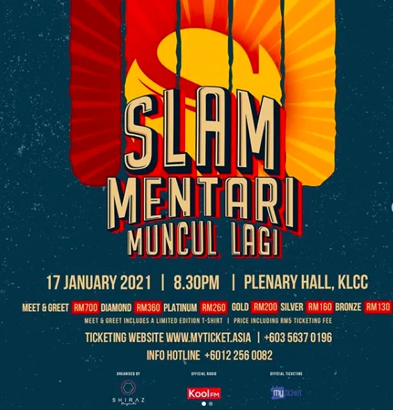 Slam yang dianggotai Zamani, Shah, Eddie, Man dan Lili kali terakhir membuat konsert adalah sekitar tahun 2017. Harga tiket bagi Slam Mentari Muncul Lagi bermula RM700 bagi sesi bersama peminat dan diikuti RM360 (Diamond), RM260(Platinum), RM200 (Gold), RM160 (Silver), RM130 (Bronze) yang boleh dibeli di www.myticket.asia.