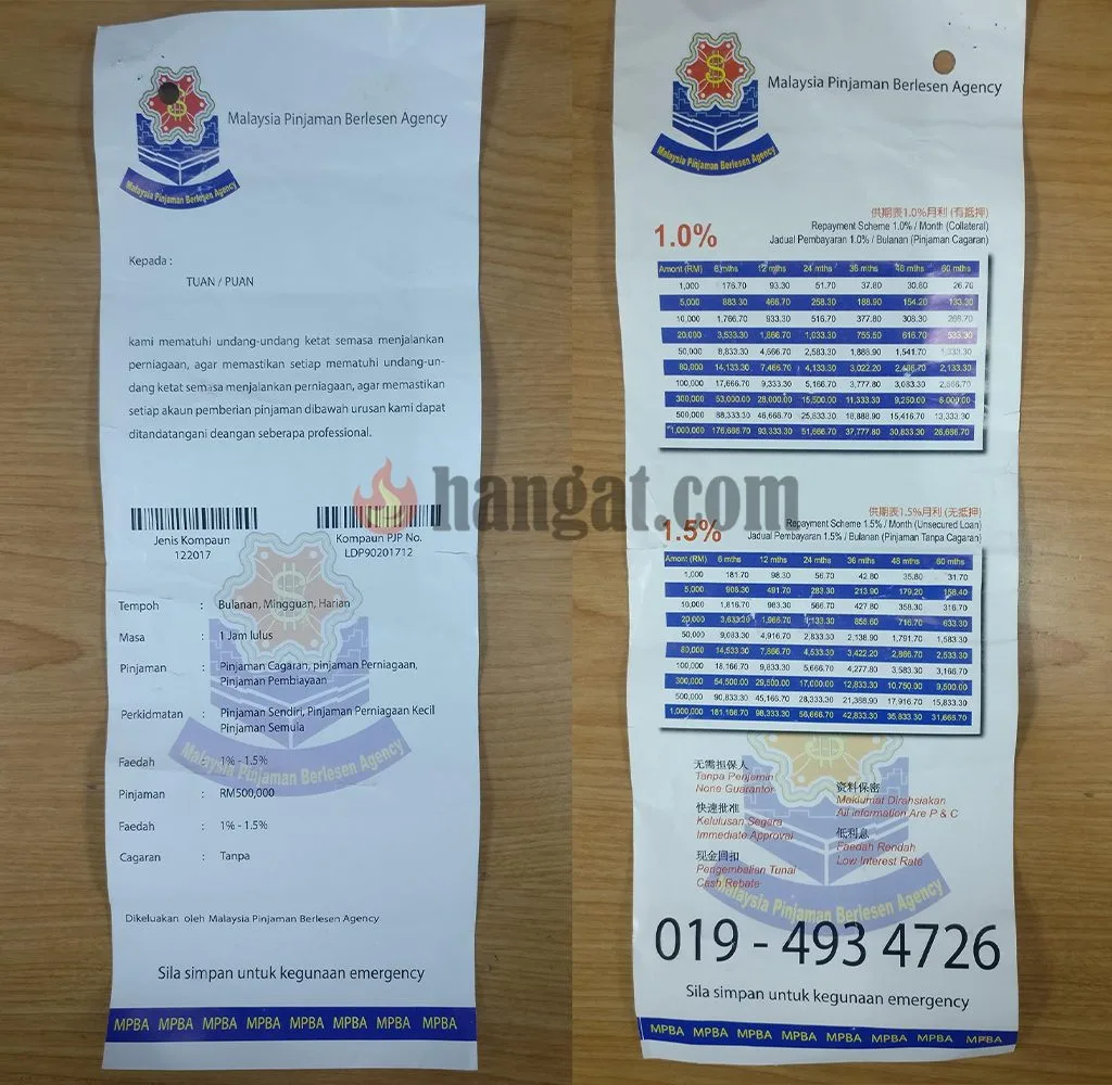 Mereka menggelarkan diri sebagai “Malaysia Pinjaman Berlesen Agency (MPBA)”, telah meletakkan risalah pada cermin dan pintu kereta.