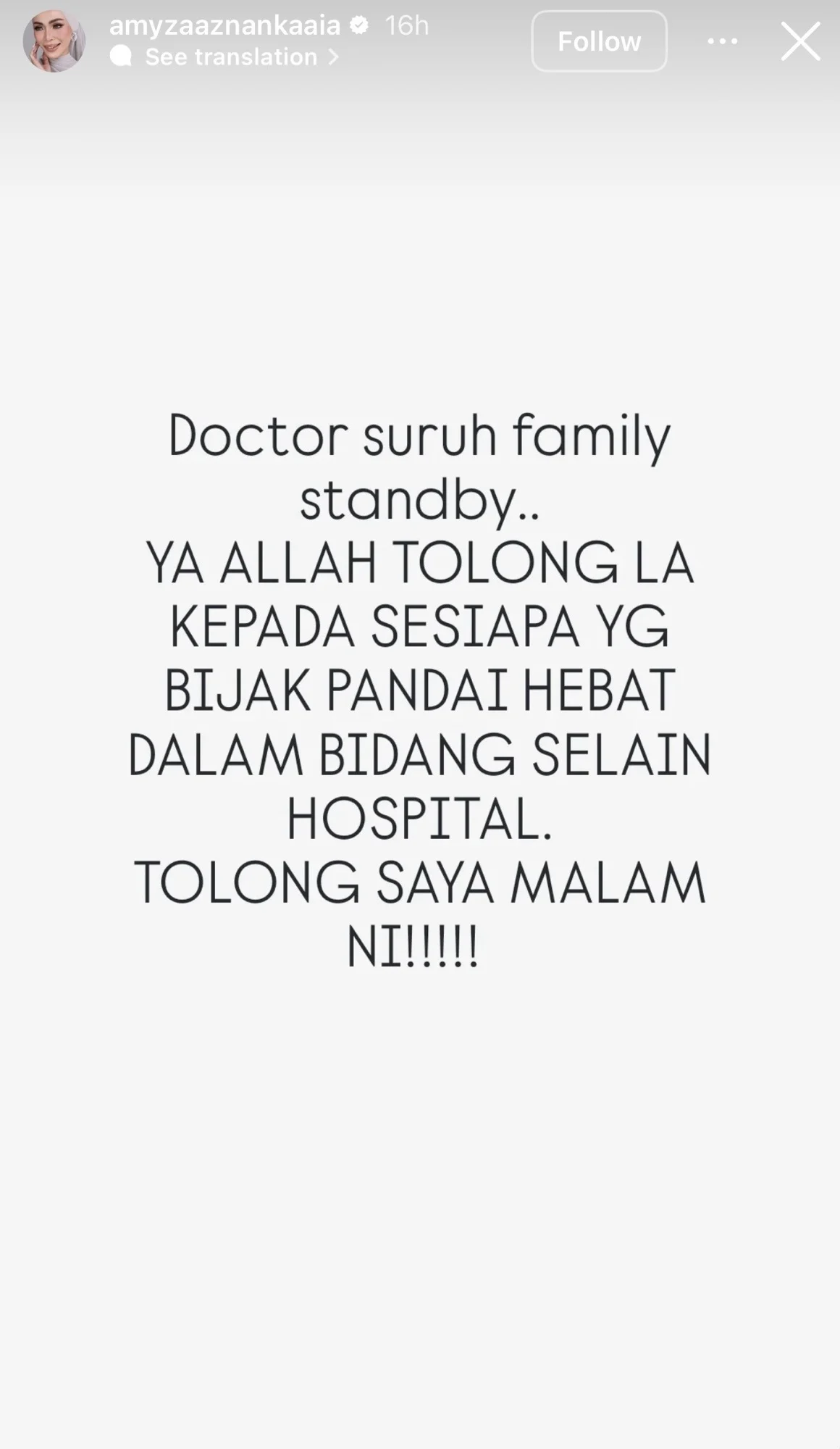 Dalam satu perkongsian yang cukup meruntun hati, Amyza memaklumkan doktor meminta keluarga bersedia terhadap sebarang kemungkinan.