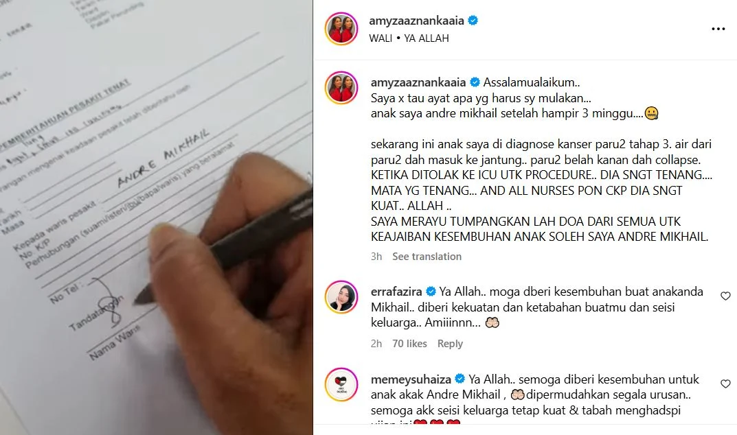 MURAI masih ingat saat video itu dimuat naik di Instagram. Wajah Amyza tenang, tetapi mata seorang ibu tidak pernah mampu menipu rasa. Tiga minggu Andre dirawat di Hospital Ampang, Selangor sebelum Amyza berkongsi berita sebenar. Ketika itu, beliau dilihat mengisi borang kebenaran prosedur rawatan, satu detik yang pasti merobek jiwa mana-mana ibu.