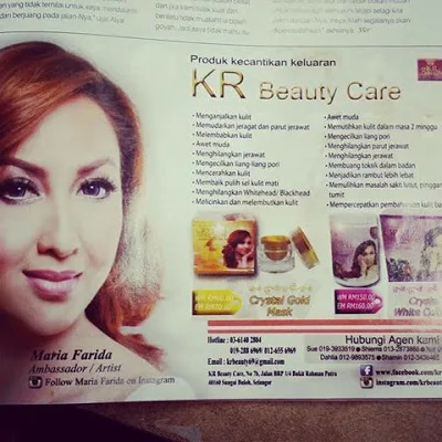 - Maria Farida telah dilantik menjadi duta dan jurucakap kepada KR Beauty Care milik Datuk Rahman Shakur dan Karen Rahman atau nama sebenarnya Hadijah Mokhtar. Ketika ini Maria dan Karen berkawan baik