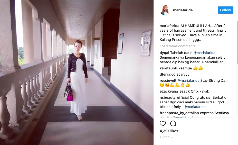 “ALHAMDULILLAH… After 2 years of harrasement and threats, finally justice is served! Have a lovely time in Kajang Prison darlinggg..”