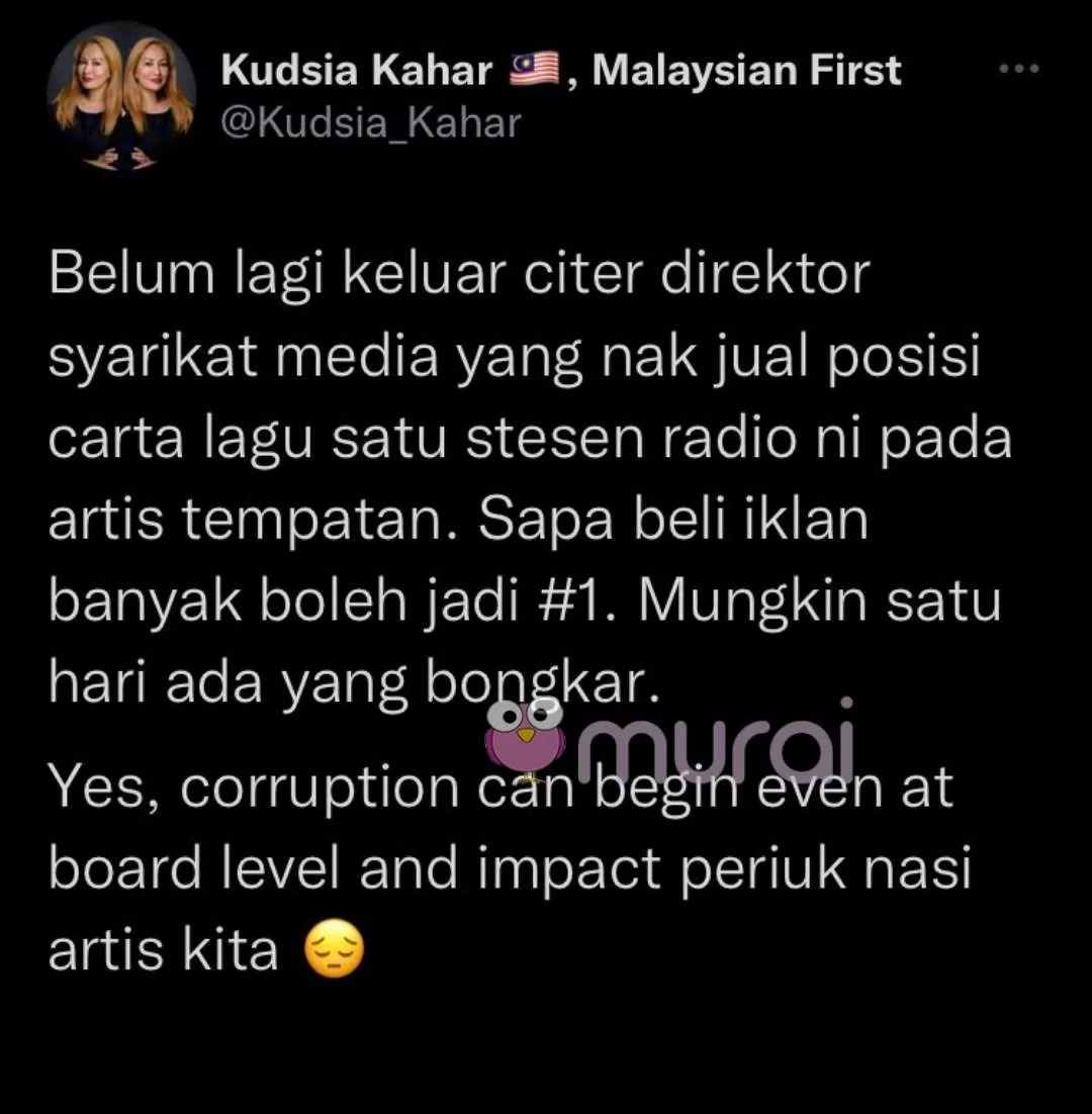 Personaliti radio terkenal, Kudsia Kahar mendedahkan terdapat pengarah syarikat media yang ingin menjual posisi carta lagu sebuah stesen radio kepada artis tempatan. Difahamkan, artis yang membeli banyak iklan boleh berada di kedudukan carta muzik yang teratas.