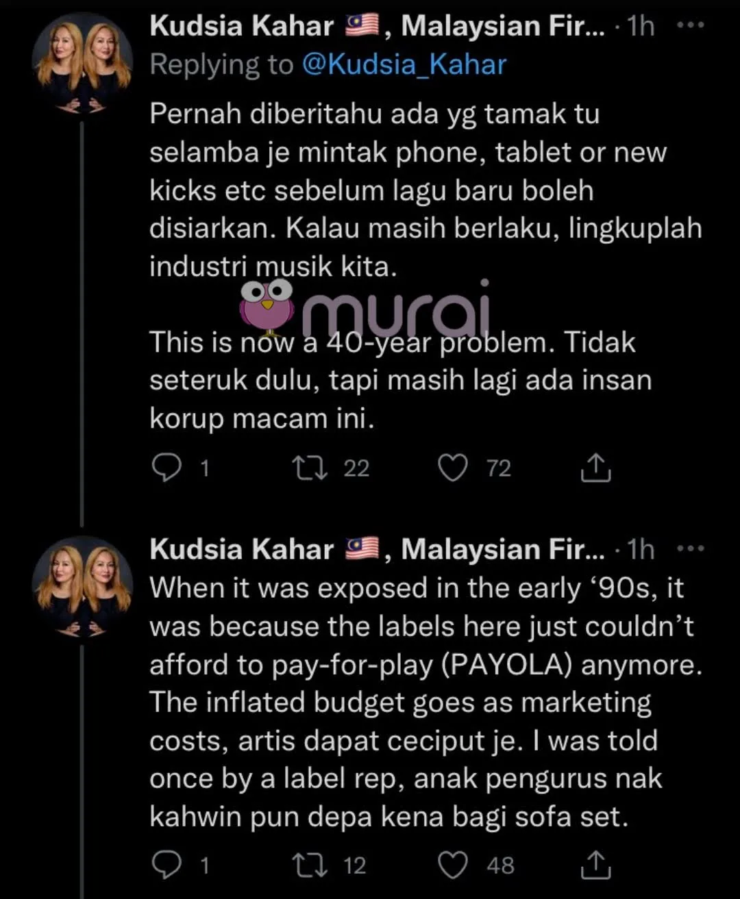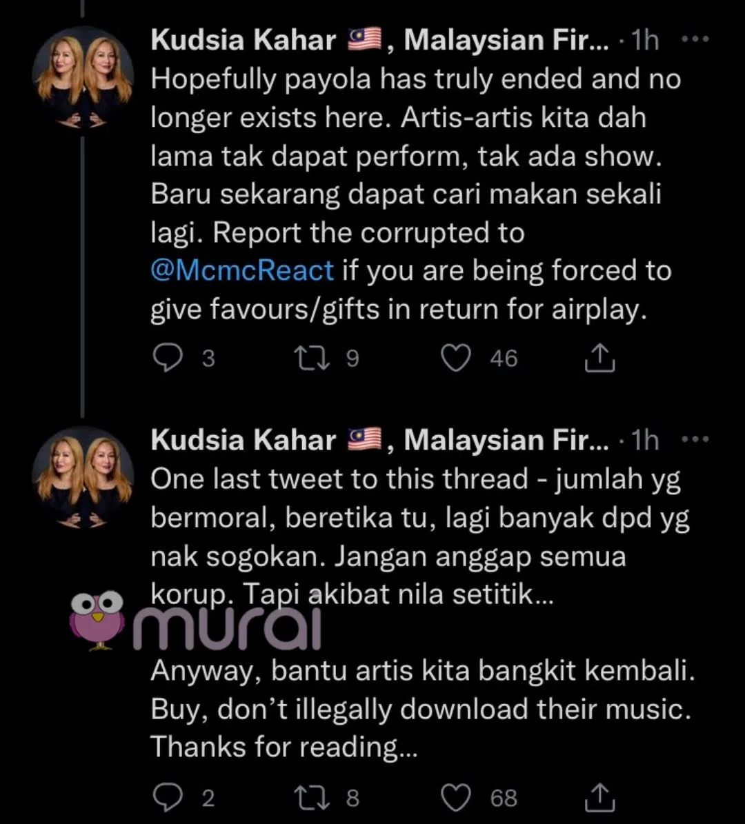 Menerusi bebenang ciapan di laman Twitter miliknya, Kudsia yang juga bekas Presiden Radio Komersial Malaysia (CRM) menyifatkan industri muzik bakal lingkup sekiranya isu tersebut masih berlaku.