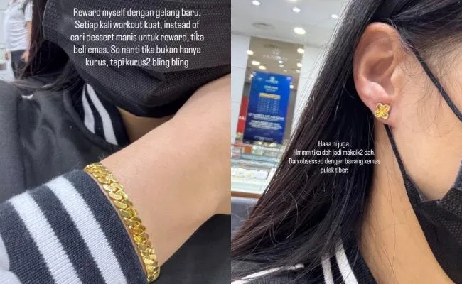 “Beri ganjaran kepada diri sendiri dengan gelang dan subang telinga baharu. Setiap kali senaman kuat, saya beli emas. Jadi nanti saya bukan sahaja kurus, tapi ‘bling-bling’,” katanya sambil disertai emoji ketawa. Dalam nada bergurau, Atikah mengakui dirinya kini semakin obses mengumpul barang kemas dan melabel diri sebagai “mak cik-mak cik” kerana minatnya itu.