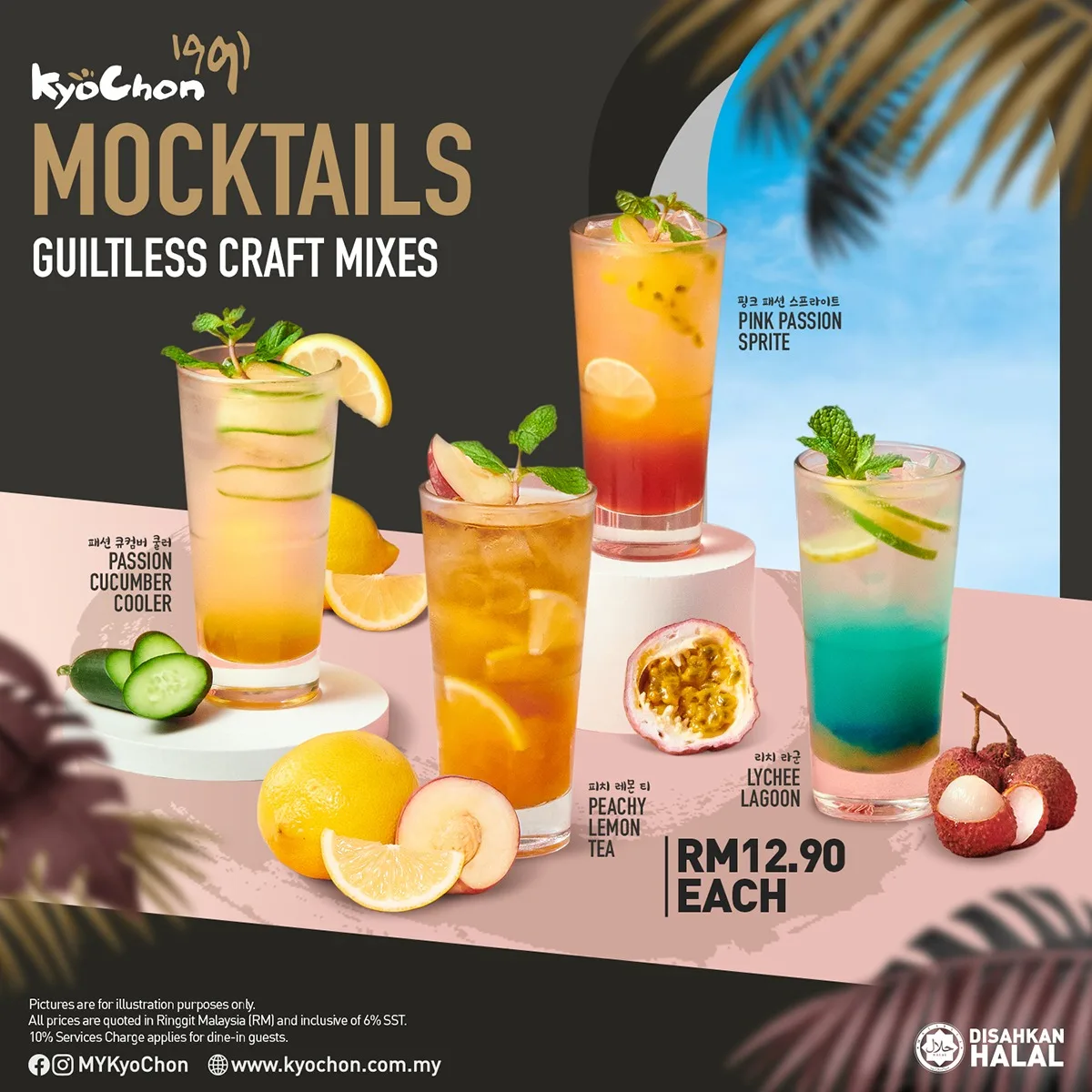 Nikmati syurga dengan Mocktails KyoChon 1991 seperti Lychee Lagoon, Passion Cucumber Cooler, Peachy Lemon Tea dan Pink Passion Sprite, tersedia secara eksklusif untuk makan-makan di restoran terpilih sahaja.