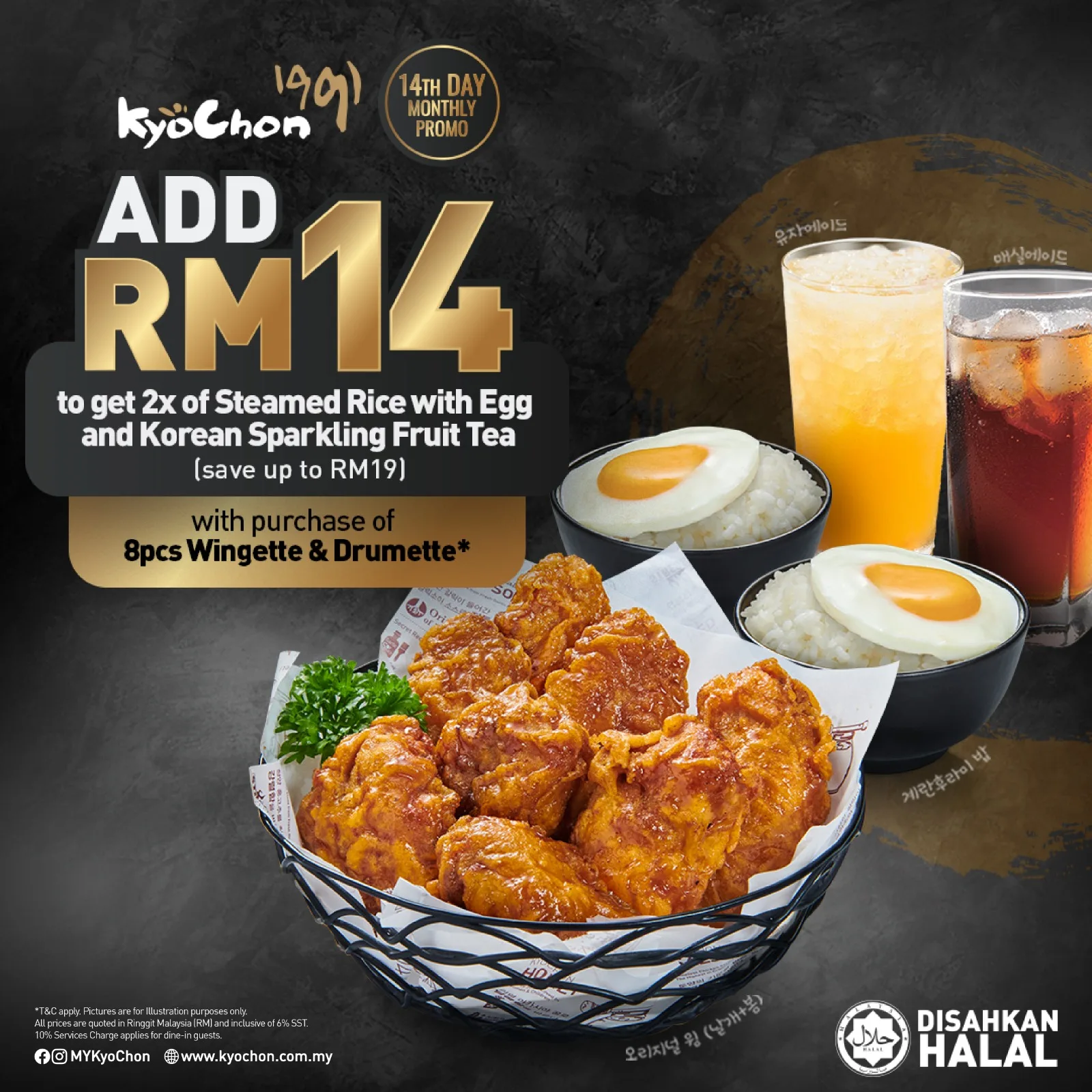 KyoChon 1991 turut teruja untuk mengumumkan promosi hari ke-14 setiap bulan. Bagi setiap pembelian 8 ketul Wingettes dan Drummettes, pelanggan boleh menikmati hidangan lengkap untuk dua orang dengan menambah RM14 untuk mendapatkan 2 nasi putih dengan telur goreng dan 2 Korean Sparkling Fruit Tea. Promosi luar biasa ini akan hanya boleh didapati pada 14 Mei 2024 dan 14 Jun 2024 dan hanya untuk makan di restoran kami yang terpilih sahaja.