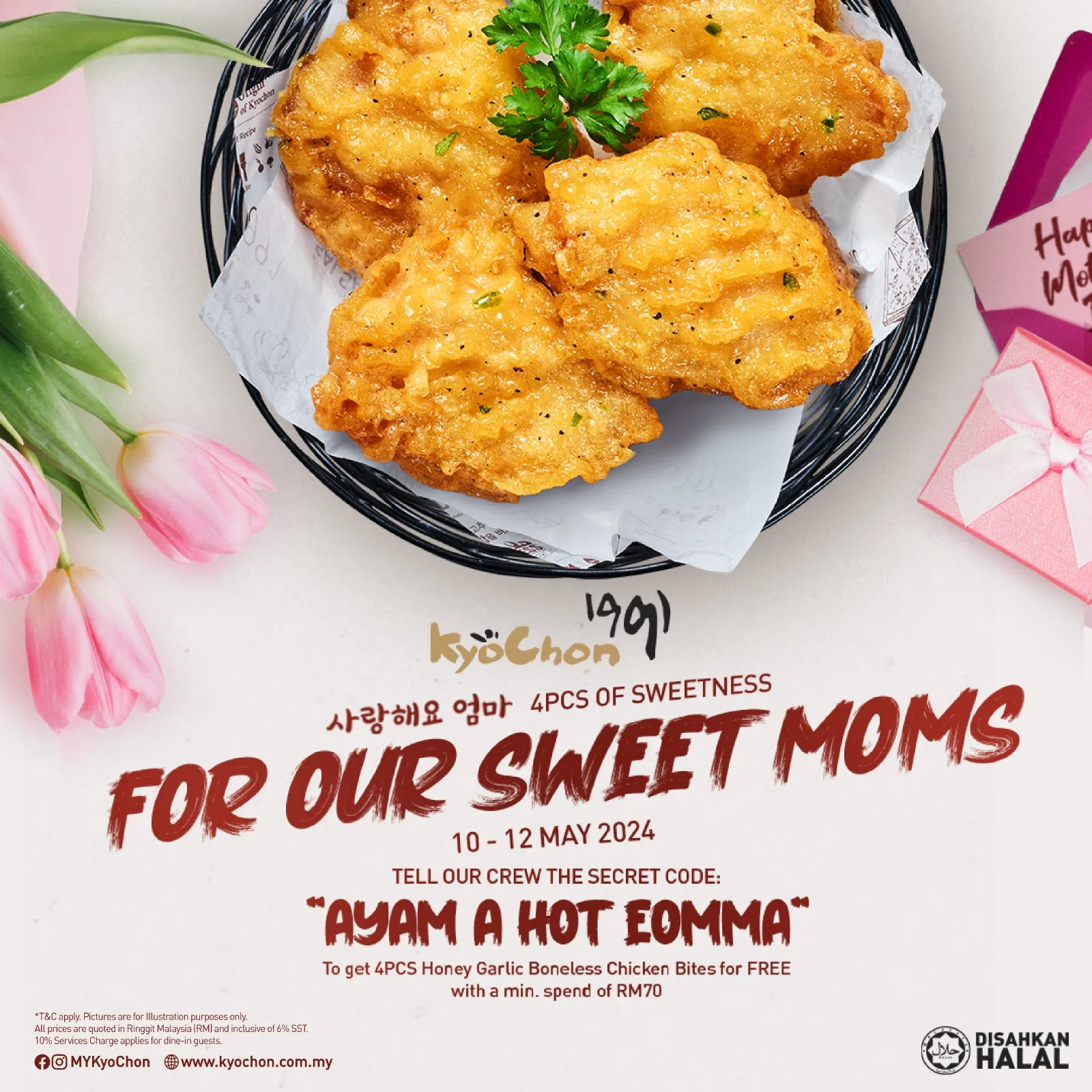 Dari 10 hingga 12 Mei 2024, pelanggan boleh melayan ‘Eomma’ mereka dengan pengalaman menjamu selera yang tidak dapat dilupakan bersama KyoChon 1991 – Dengan hanya memberitahu kod rahsia “Ayam A Hot Eomma” kepada mana-mana kakitangan KyoChon 1991 dan menikmati 4 ketul Honey Garlic Boneless Chicken Bites secara percuma, dengan perbelanjaan minimum RM70.
