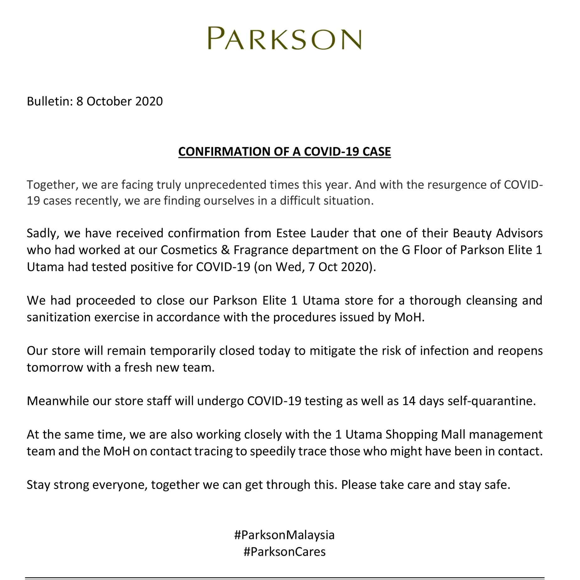 Sebentar tadi, Parkson Malaysia menerusi hantaran di laman Facebook memaklumkan terdapat salah seorang kakitangan mereka di Parkson Elite, Pusat Membeli Belah 1 Utama, Petaling Jaya disahkan positif COVID-19.