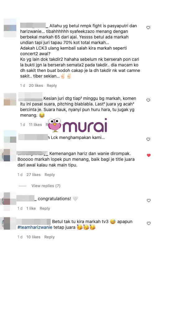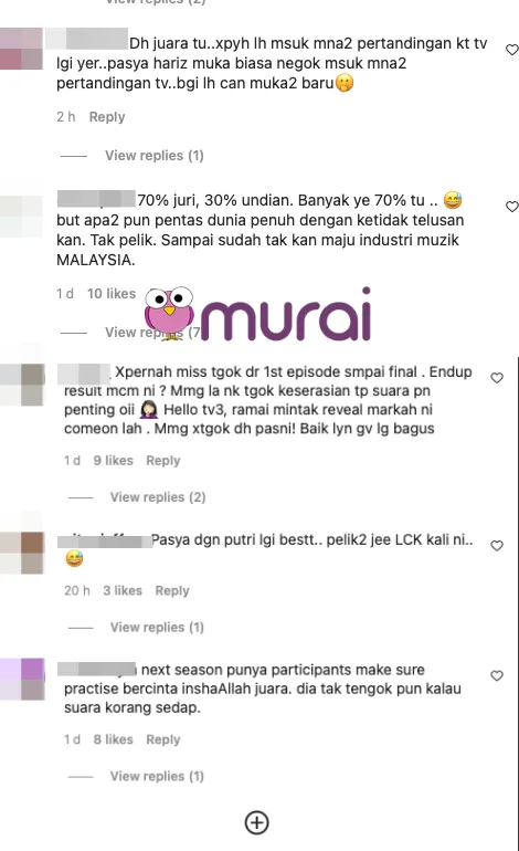 “tak pernah miss tengok dari 1st episode sampai final. Endup result macam ini ? Memang la nak tengok keserasian tapi suara pun penting oii ??♀️ Hello tv3, ramai mintak reveal markah ni come on lah . Memang tak tengok dah lepas ini! Baik layan GV lagi bagus” komen salah seorang daripada netizen