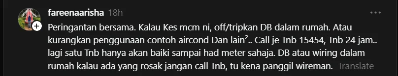Ada yang menasihatkan supaya segera ‘trip’ suis utama di Distribution Board (DB) sekiranya berlaku percikan atau bekalan tidak stabil, selain mengurangkan penggunaan peralatan elektrik berat seperti penghawa dingin.