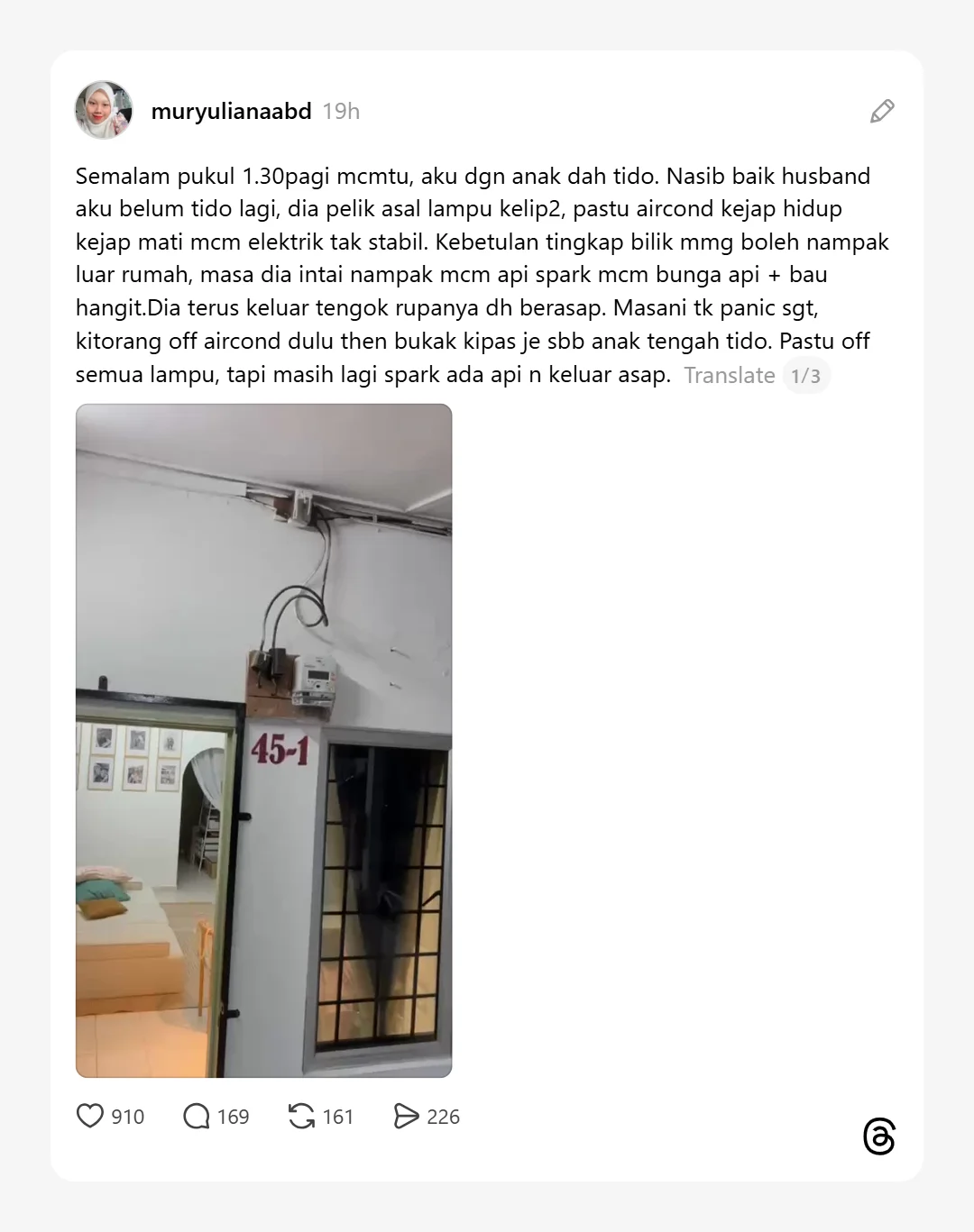 Insiden ini menjadi peringatan bahawa simptom seperti lampu berkelip, bau hangit dan percikan kecil bukan perkara remeh.