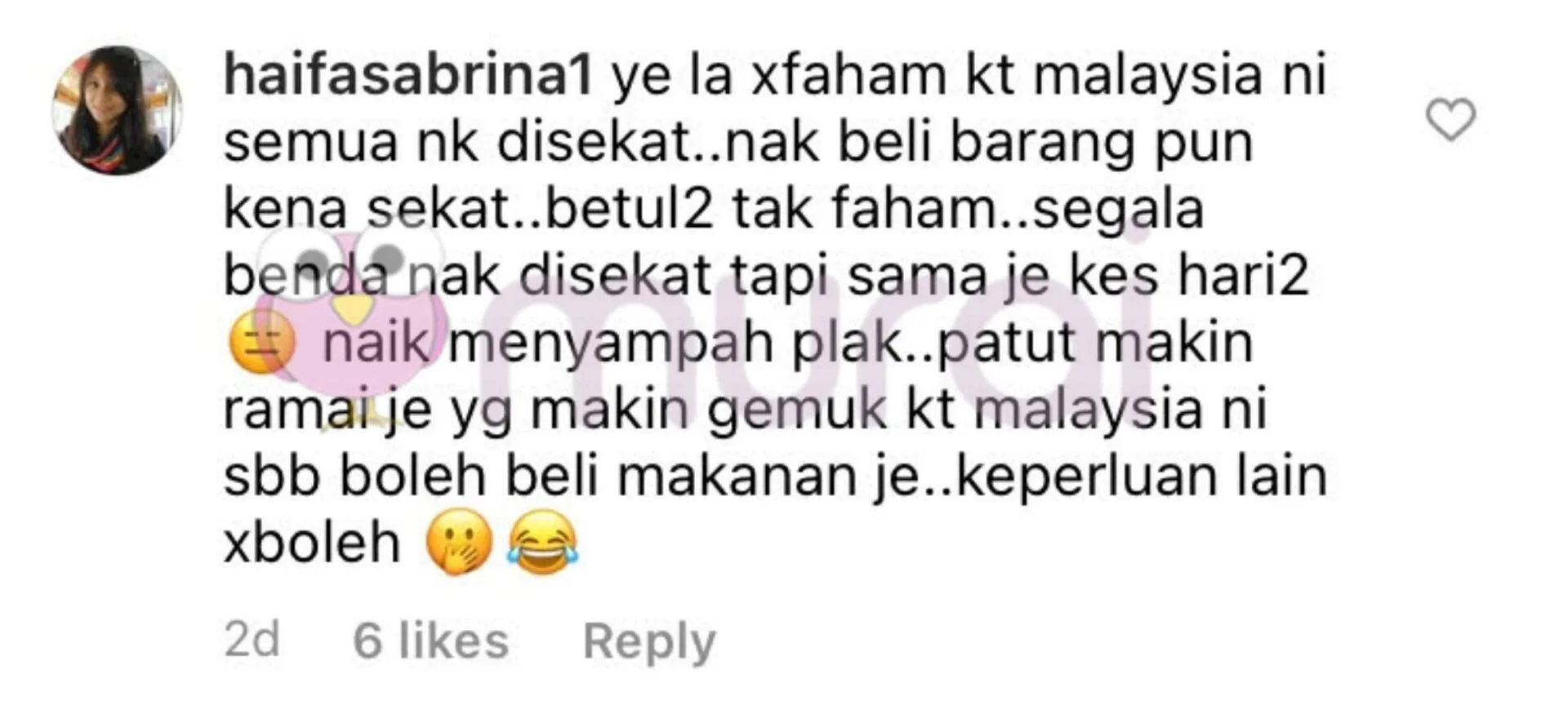 “Ye la tak faham kat Malaysia ni semua nak disekat ..nak beli barang pun kena sekat..Betul-betul tak faham..Segala benda nak disekat tapi sama je kes hari-hari naik menyampah plak..patut makin ramai je yang makin gemuk kat Malaysia ni sebab boleh beli makanan je..keperluan lain tak boleh.”- katanya