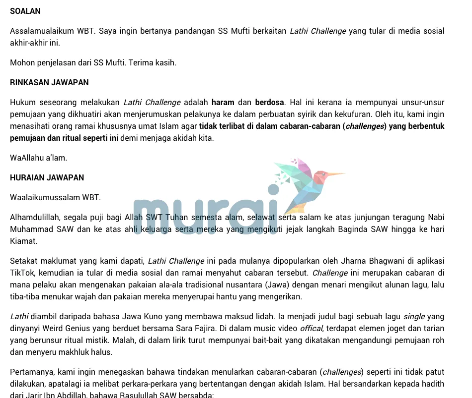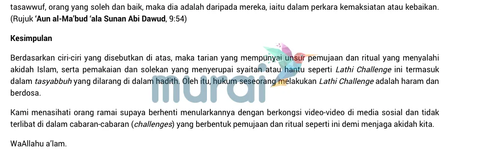 “Lathi Challenge ini termasuk dalam tasyabbuh yang dilarang di dalam hadith. Oleh itu, hukum seseorang melakukan Lathi Challenge adalah haram dan berdosa,” katanya dalam kenyataan tersebut.