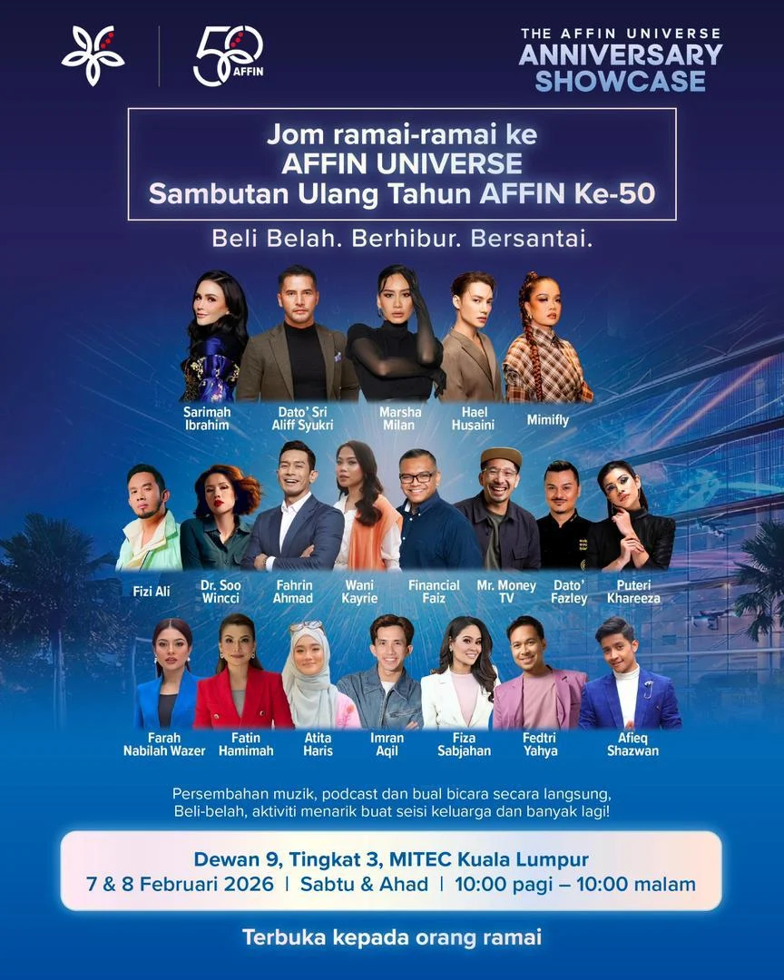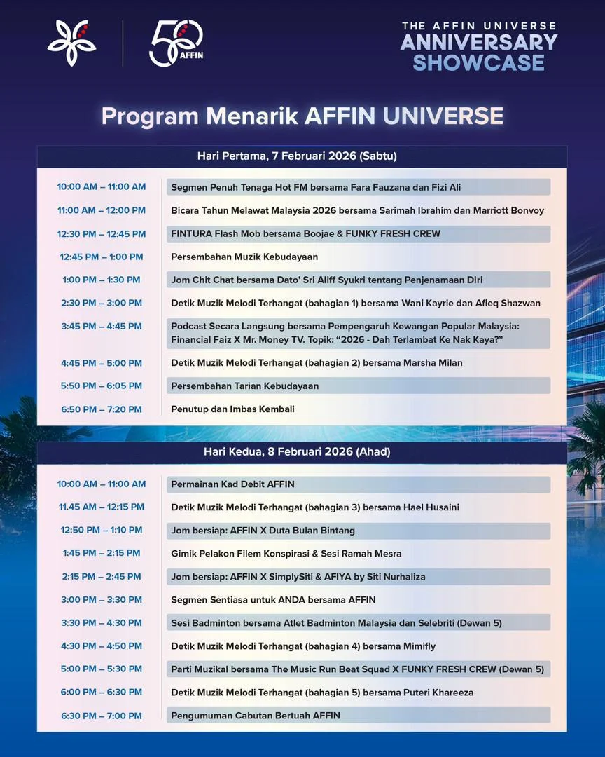Acara ini berlangsung pada 7 & 8 Februari 2026 (Sabtu & Ahad), 10 pagi hingga 10 malam, melalui AFFIN Universe Anniversary Showcase. Tidak seperti pameran biasa, pengunjung boleh menikmati persembahan secara langsung, penampilan selebriti, zon interaktif, serta aktiviti yang menggalakkan penerokaan dan penglibatan. Dari POV MURAI, rasanya macam tengah “jalan-jalan di festival mini gaya hidup” setiap sudut ada sesuatu yang buat mata dan minda teruja.