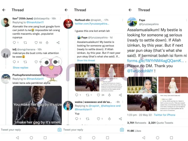 “Saya rasa ini kot entah lah (retweet ciapan cari jodoh milik akaun dikenali sebagai Faye)” syak warganet