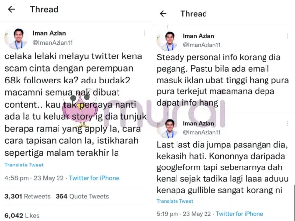Baru-baru ini tular isu scam cinta di laman Twitter, isu ini dibangkitkan oleh seorang doktor perubatan yang dikenali sebagai Iman Azlan menerusi ciapannya di Twitter.