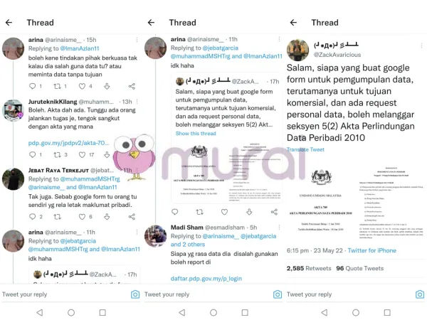 “Salam, siapa yang buat borang Google untuk pengumpulan data terutamanya untuk tujuan komersial, dan ada mohon data peribadi, boleh langgar seksyen 5(2) Akta Perlindungan Data Peribadi 2010.” Ciap warganet