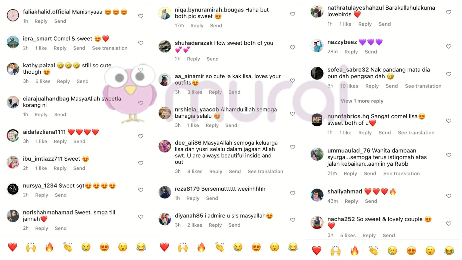 Tinjauan Murai MY di ruangan komen mendapati rata-rata netizen meluahkan rasa teruja melihat pasangan suami isteri itu malah ada yang menitipkan doa agar perkahwinan Lisa dan Yusry sentiasa diberikan kebahagiaan hingga ke Jannah.