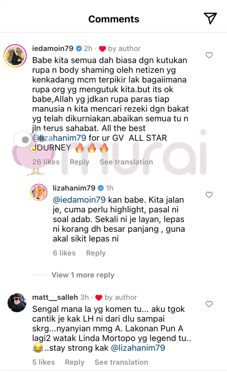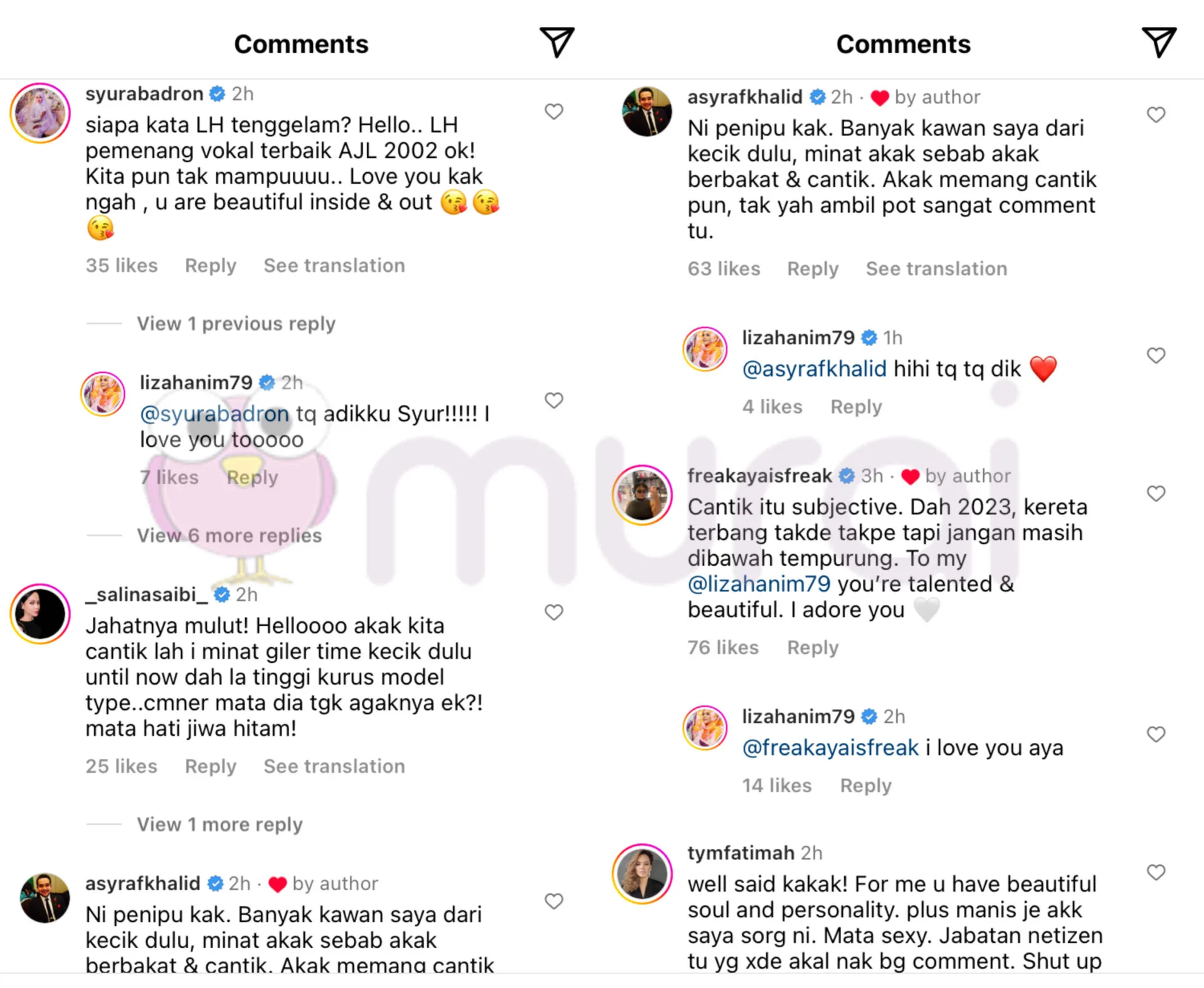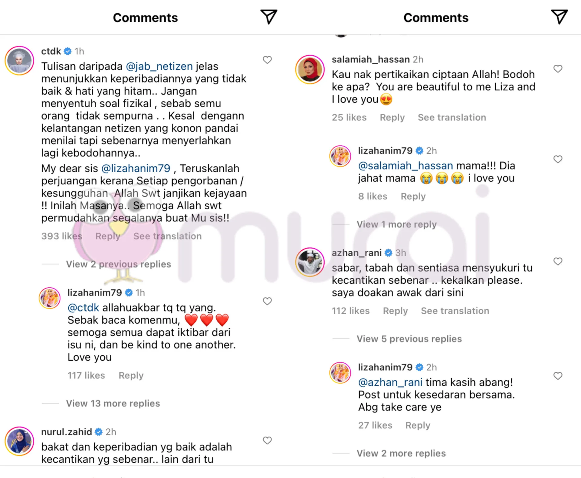 Tidak berdiam diri, perkongsian Liza Hanim turut dibanjiri dengan komen rakan selebriti termasuklah penyanyi terkenal, Datuk Seri Siti Nurhaliza yang meluahkan rasa kesal dengan kelantangan netizen berkenaan yang menyerlahkan kebodohan sendiri.