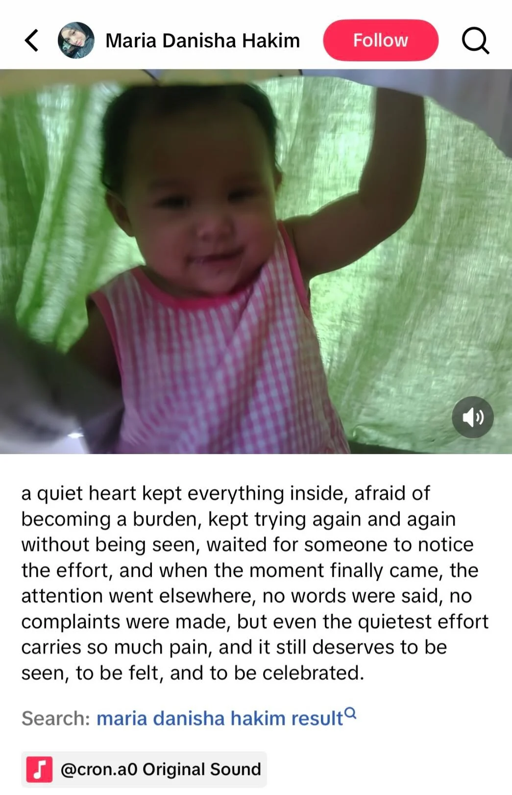 Dan apabila momen akhirnya tiba, perhatiannya hilang, tiada kata-kata yang diucapkan, tiada rungutan yang dibuat, tetapi usaha paling senyap pun membawa begitu banyak kesakitan, dan ia masih patut dilihat, dirasai, dan diraikan.”-kapsyen Maria di TikTok