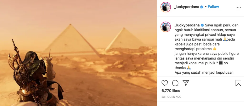 “Saya tidak perlu menjelaskan apa-apa, saya akan membawa segala yang berkaitan dengan hal privasi hidup saya hingga mati. Setiap orang mempunya cara yang berbeza  untuk menangani masalah, bukan hanya kerana saya adalah public figure maka saya melepaskan semua hal peribadi kepada umum ? Tidak, terima kasih,” Lucky menulis di Instagram.