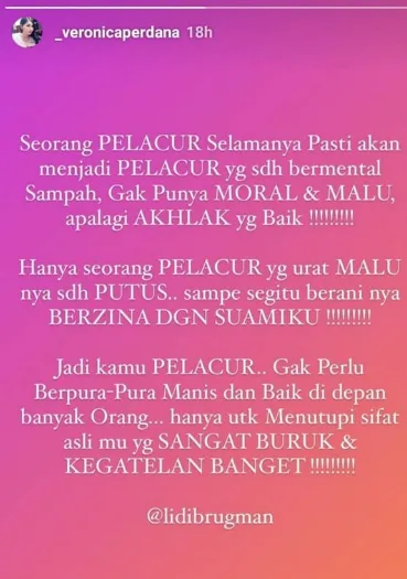 “Pelacur selamanya akan menjadi pelacur yang mempunyai mentaliti sampah, tidak mempunyai MORAL atau Malu, apalagi AKHLAK yang baik !! Hanya pelacur yang urat malunya sudha putus. Sampai begitu berani berzina dengan suamiKU !!!!,” tulis Veronica di Instagram.