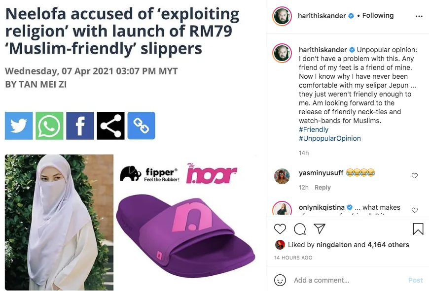 Di laman twitter, tak pasal-pasal selipar ini mendapat ‘free-marketing’ kerana ramai yang berkongsikan isu ini secara meluas. Bukan di kalangan netizen sahaja, isu selipar ”Muslim Friendly’ turut mendapat perhati pelawak dan pelakon, Harith Iskander.