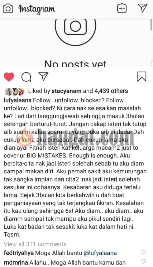 Terbaru, seperti mengesahkan dakwaan netizen sebelum ini akhirnya Lufya akui mempunyai masalah rumah tangga selepas nekad memuat naik sebuah posting yang mendedahkan bawah akaun Instagram nya telah disekat oleh suaminya sendiri.