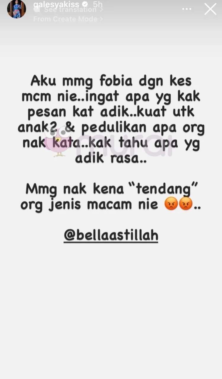 Dalam pada itu, pelakon, Balkish Semundur Khan turut memberikan kata-kata semangat buat Bella untuk terus kuat demi anak-anak serta tidak mengambil peduli akan kata-kata orang orang.