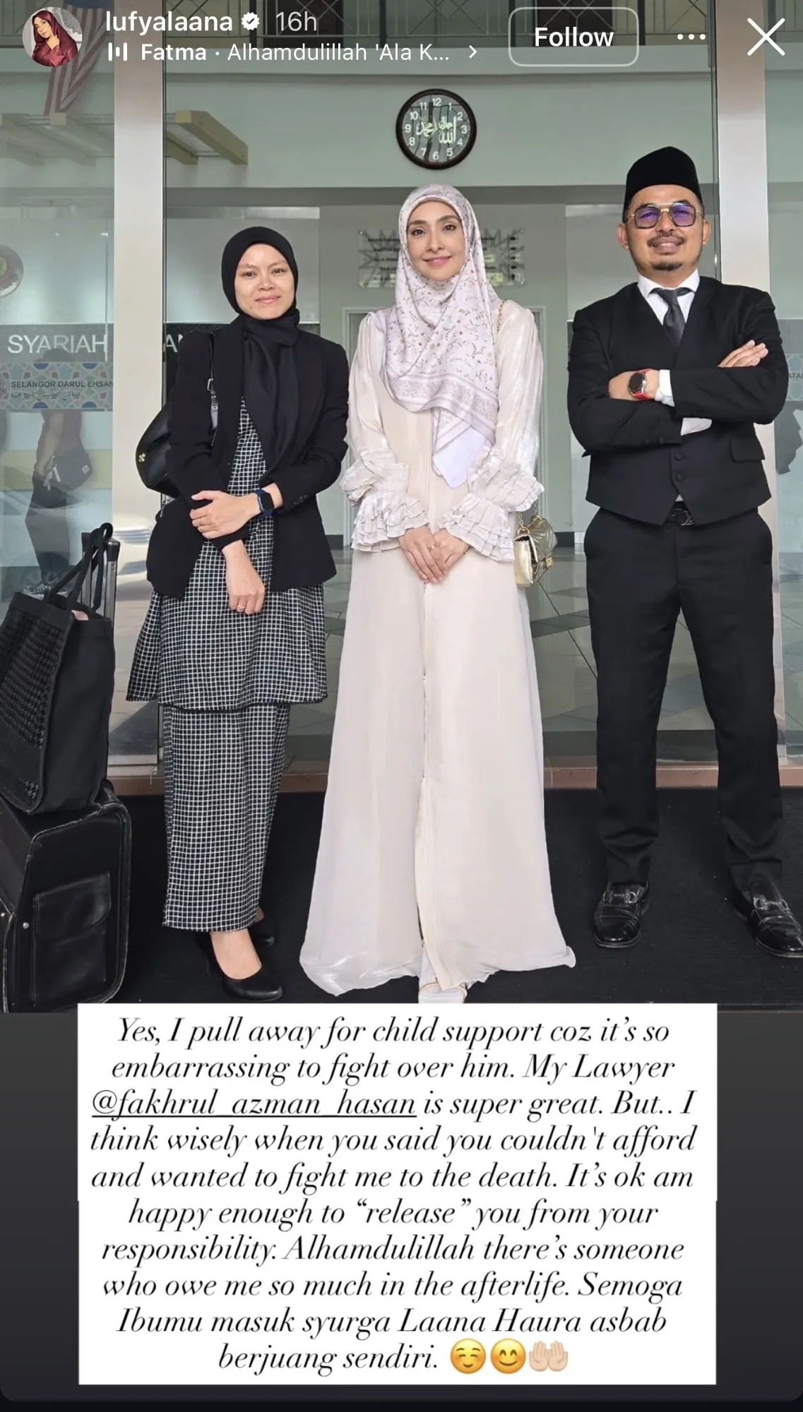 “Ya saya tarik diri isu nafkah kerana saya malu untuk terus bergaduh dengannya.”-tulis Lufya di Insta Stories