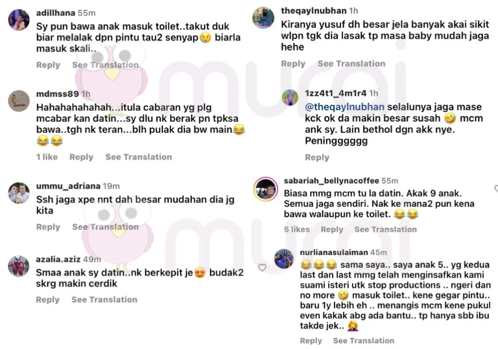 “Sama saya, saya anak 5.. yang kedua last dan last memang menginsafkan kami suami isteri untuk stop productions..ngeri dan no more. masuk toilet kene gegar pintu.. baru 1 tahun lebih eh, menangis macam kene pukul even kakak abang ada bantu tapi hanya sebab ibu takde jek”-kata mereka
