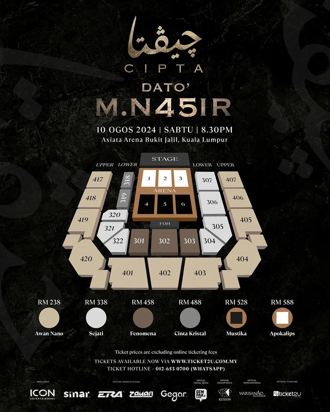 Harga tiket bermula dengan RM 238 (AWAN NANO), RM338 (SEJATI), RM458 (FENOMENA), RM488 (CINTA KRISTAL), RM528 (MUSTIKA), RM588 (APOKALIPS) menanti anda.