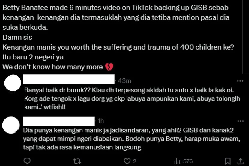 Namun begitu, Betty tidak dapat mengelak daripada menerima kecaman daripada netizen, yang menganggap pujiannya terhadap GISB sebagai tidak sensitif terhadap nasib ahli-ahli dan kanak-kanak yang didakwa telah dianiaya.