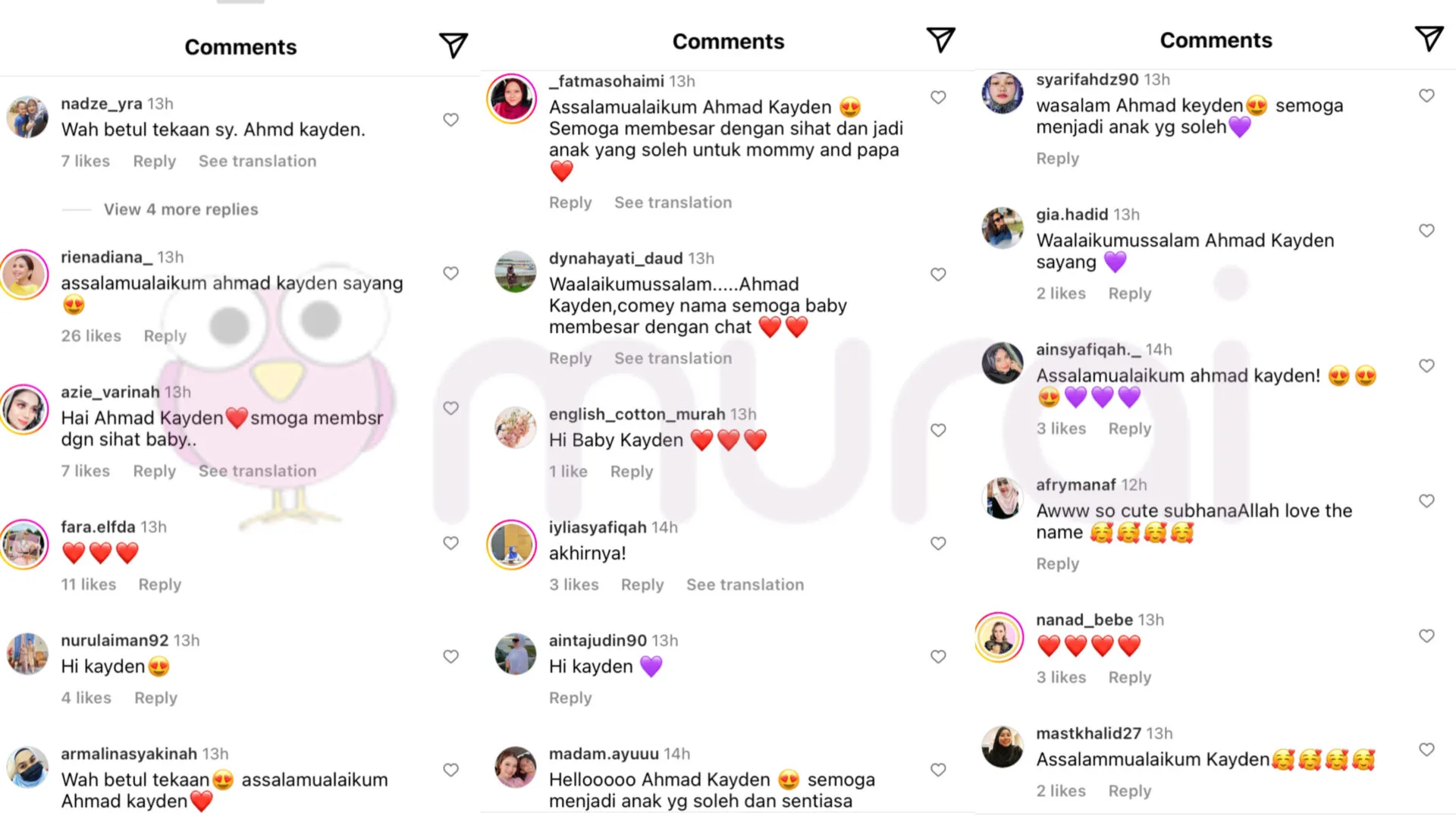 Perkongsian Madammu di Instagram turut dibanjiri dengan komen peminat yang menitipkan doa buat Ahmad Kayden, malah ramai yang rasa teruja apabila dapat meneka nama anak Madammu dengan tepat.
