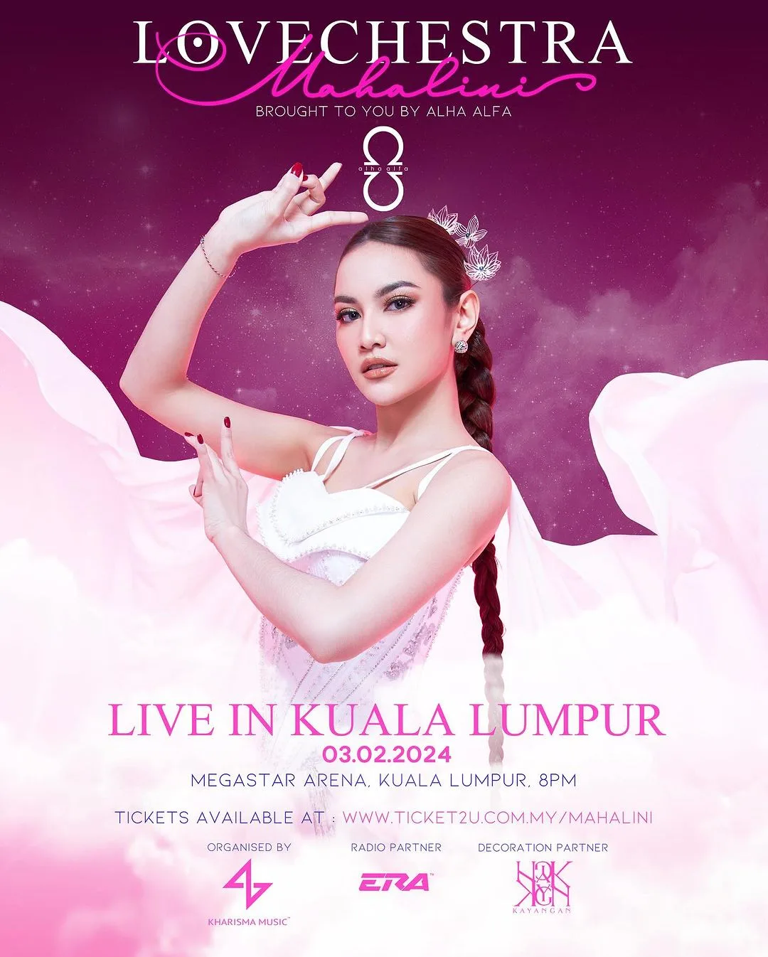 “LOVECHESTRA MAHALINI live in Kuala Lumpur, 3 Februari 2024, Megastar Arena Kuala Lumpur.”-tulis penganjur