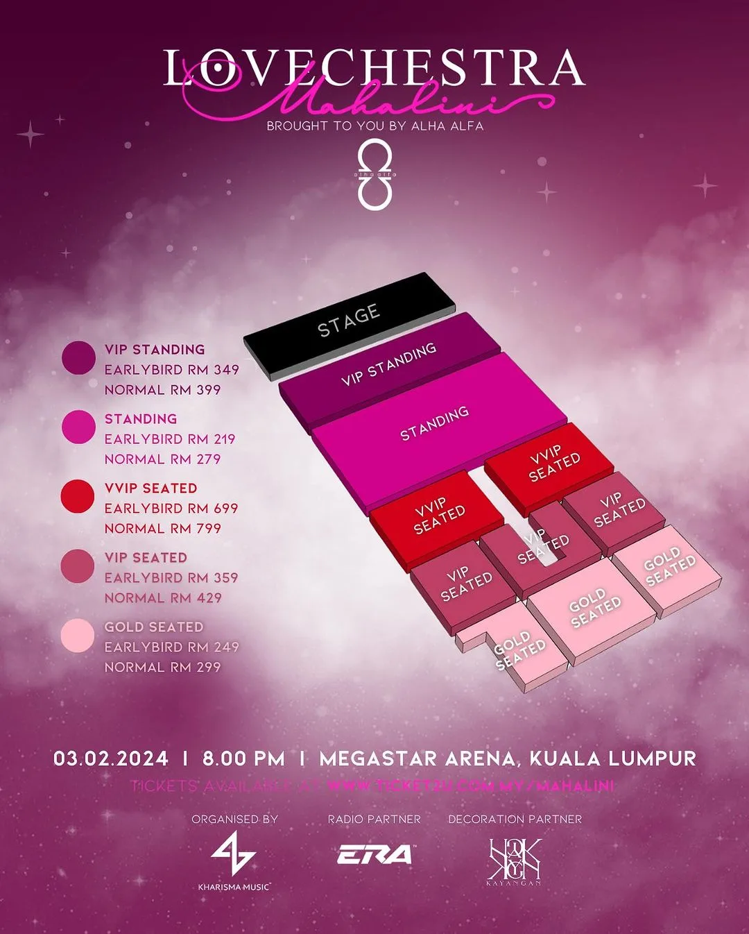 Apa yang pasti, banyak lagu ‘hits’ yang akan dipersembahkan oleh Mahalini di Mega Star Arena, Kuala Lumpur pada Februari 2024! Harga tiket bermula RM299, rm279, RM399, RM429, RM799 (VVIP Seated) .