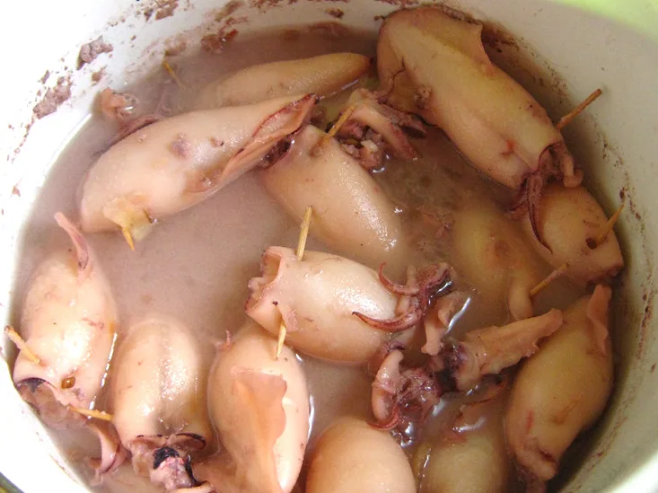 Sotong yang diisi pulut bersantan ini dimasak dalam kuah pekat, menghasilkan rasa manis berlemak yang unik.