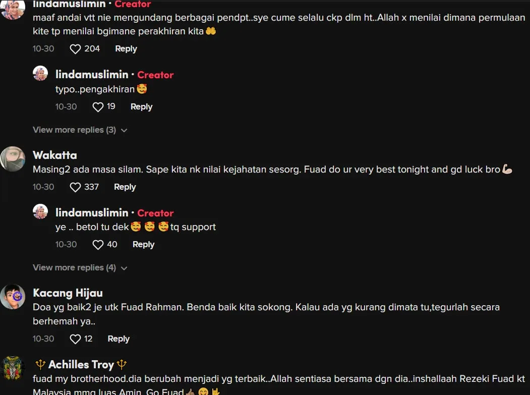 “Masing-masing ada masa silam. Sape kita nak nilai kejahatan seseorang. Fuad do your very best tonight and good luck bro??.” antara komen netizen.