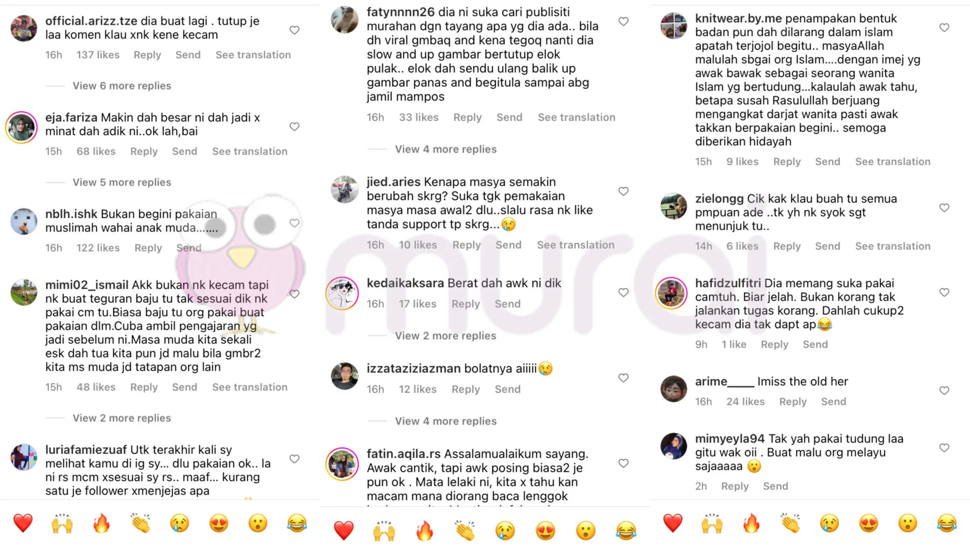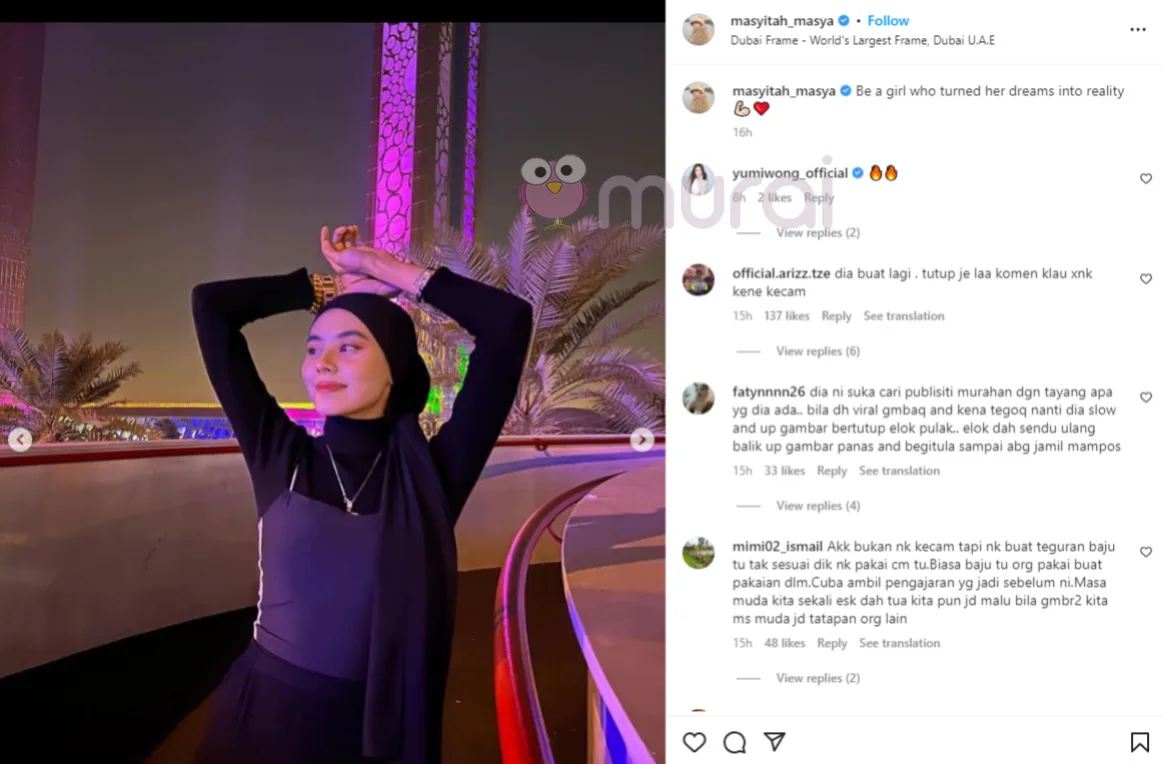Ekoran itu, ruangan komen entri pelantun lagu Hapus dibanjiri dengan kritikan dan teguran buat Masya yang didakwa masih belum serik dikecam berhubung isu penampilannya.