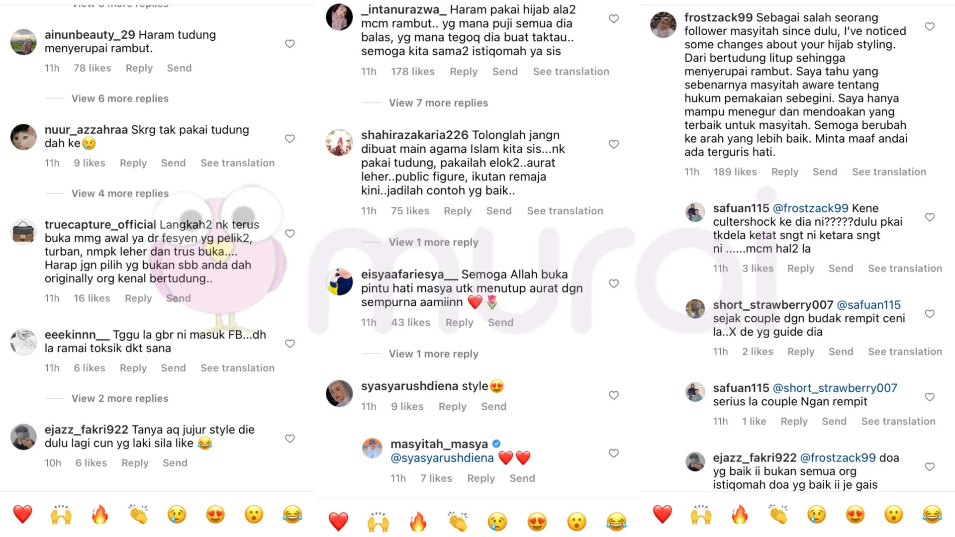 “Tolonglah jangan dibuat main agama Islam kita sis…nak pakai tudung, pakailah elok2..aurat leher..public figure, ikutan remaja kini..jadilah contoh yang baik..”