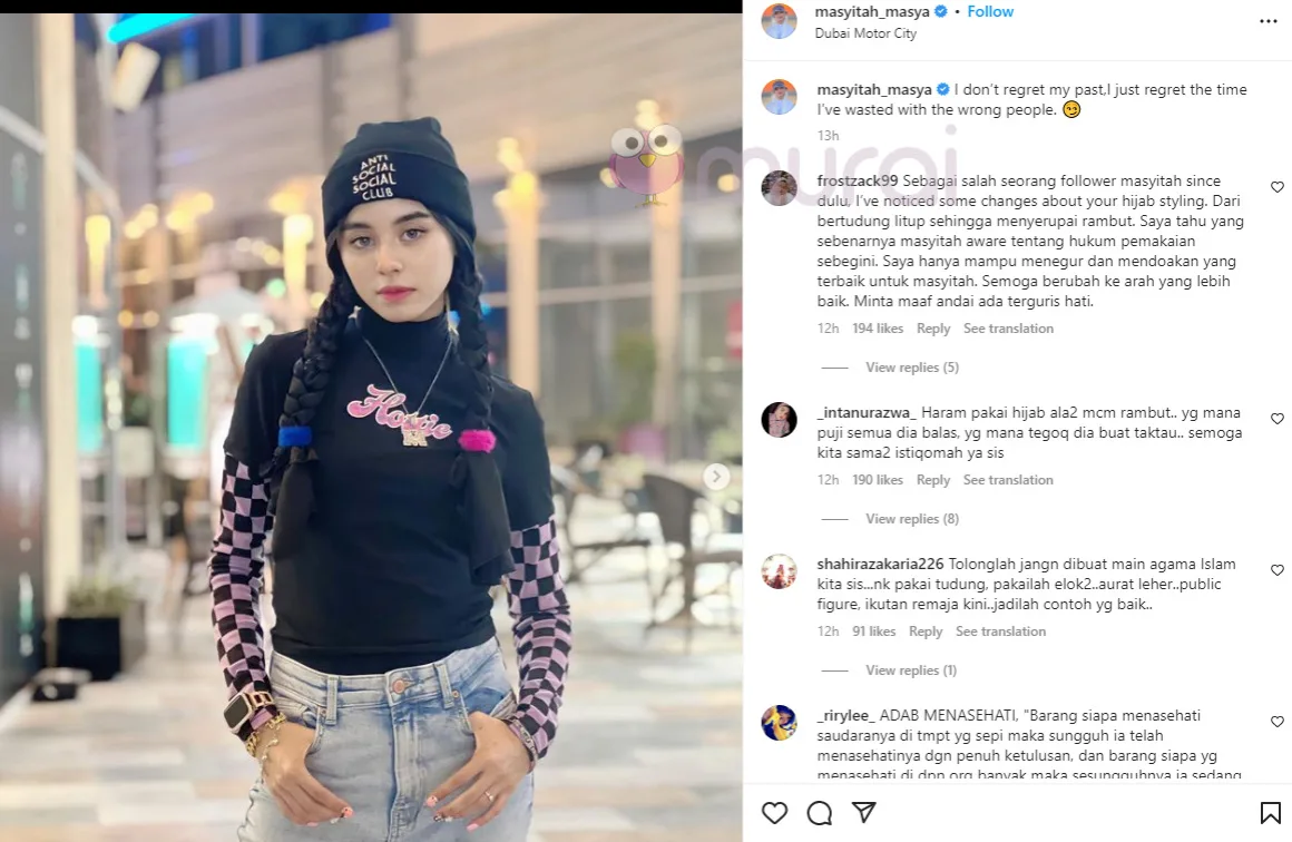 “Saya tidak menyesal dengan masa lalu saya, saya hanya menyesal dengan masa yang telah saya sia-siakan dengan orang yang salah.”-Kapsyen Masya Masyitah di Instagram
