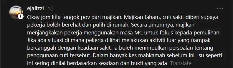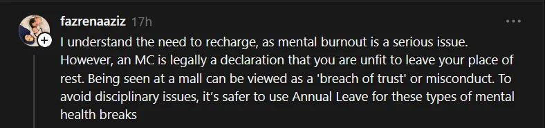 Meninjau di ruangan komen, rata-rata netizen turut menekankan bahawa walaupun MC diberikan, ia secara asasnya membawa maksud pekerja “tidak sihat untuk bekerja”.