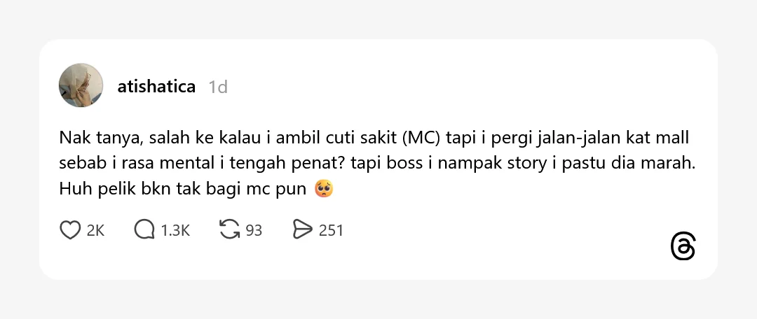 Tular di Thread mengenai satu situasi yang mencetuskan perbincangan hangat apabila seorang pekerja mempersoalkan sama ada salah untuk keluar berjalan di pusat beli-belah ketika sedang mengambil cuti sakit (MC) atas alasan keletihan mental.