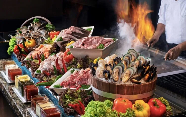 Alami pelbagai pilihan yang lazat, bermula dengan makanan laut yang menakjubkan pada paparan ais. Nikmati makanan laut seperti tiram, udang harimau, dan kerang yang dihidangkan dengan segar, semuanya disediakan untuk memikat selera anda. Saksikan secara langsung chef berbakat menyediakan Teppan BBQ, menyajikan stik yang lazat, daging kambing yang lembut, dan ikan bakar yang di hadapan mata anda.