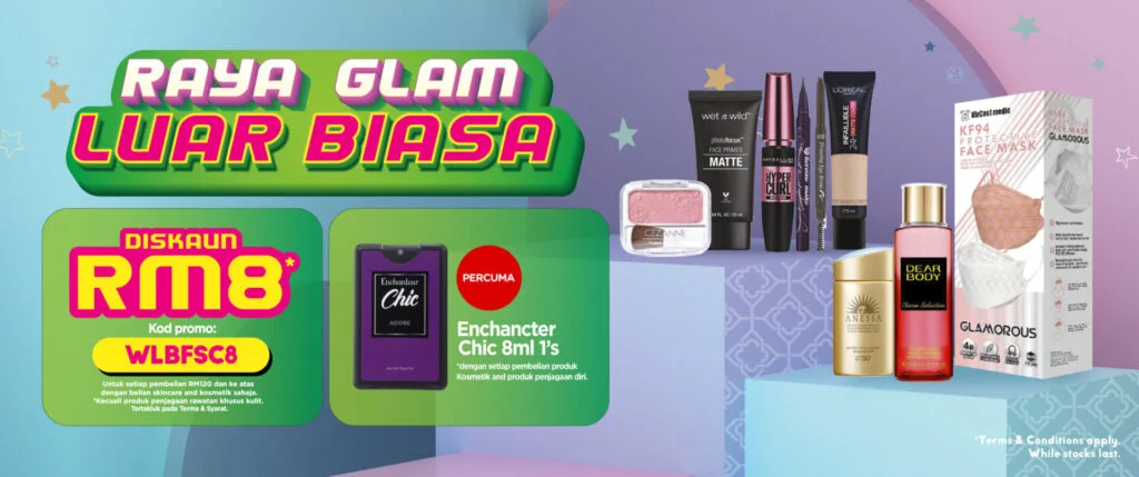 - Dengan memasukkan kod promo khas, potongan sehingga RM8 bagi setiap pembelian RM120 bagi produk kosmetik atau penjagaan wajah di kedai ataupun di dalam talian.