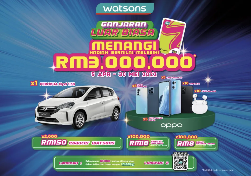 Khas untuk ahli Watsons, ada tawaran menarik untuk anda. Jika anda berbelanja dengan Watsons dengan menggunakan grabpay dalam pembayaran, anda berpeluang untuk memenangi hadiah berjumlah RM3,000,000. Banyak tu! [KLIK]